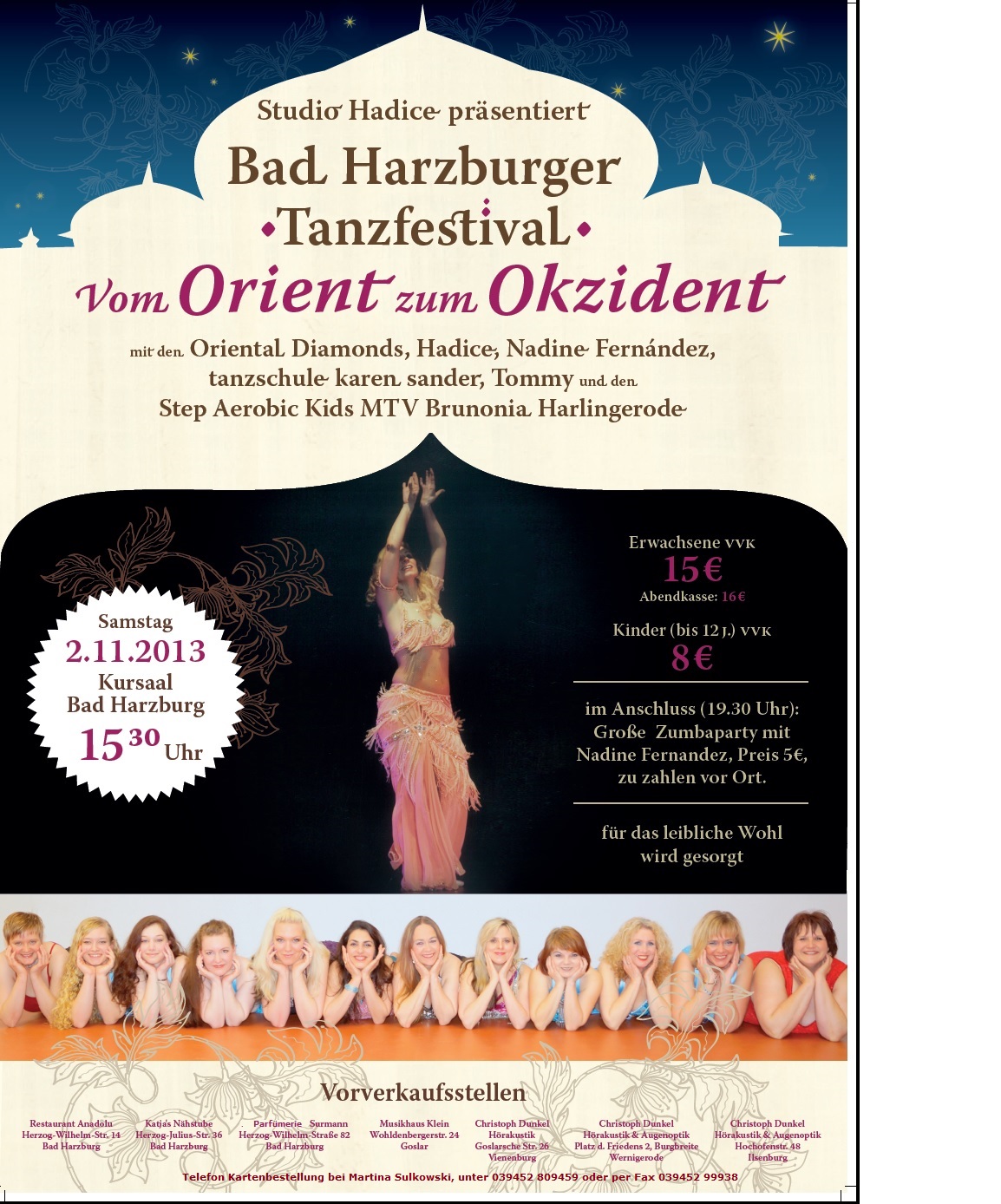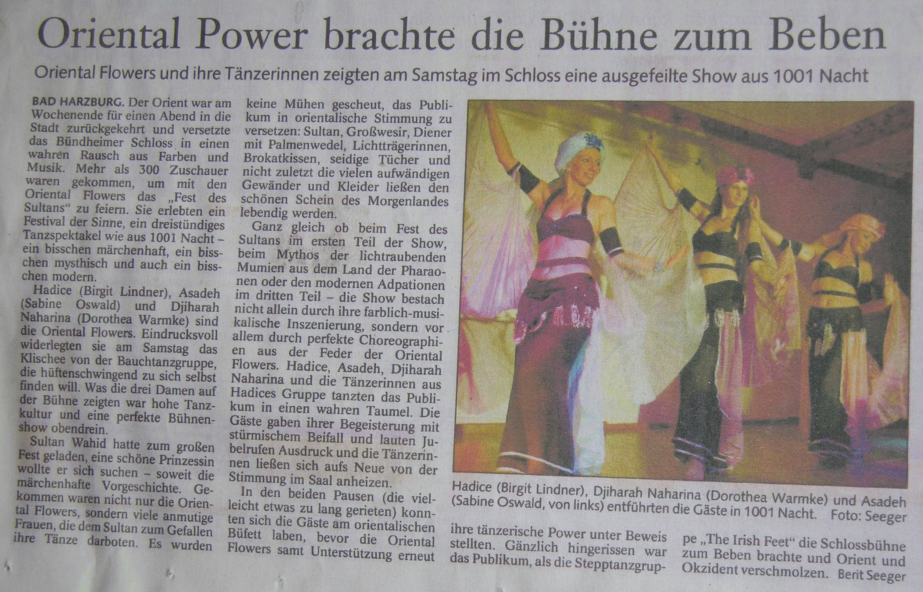 | Oriental Flower brachte die Bühne zum Beben Oriental Flowers und Ihre Tänzerinnen zeigten am Samstag im Schloss eine ausgefeilte Show aus 1001 Nacht BAD HARZBURG. Der Orient war am Wochenende für einen Abend in die Stadt zurückgekehrt und versetzte das Bündheimer Schloss in einen wahren Rausch aus Farben und Musik. Mehr als 300 Zuschauer waren gekommen, um mit den Oriental Flowers das "Fest des Sultans" zu feiern. Sie erlebten ein Festival der Sinne, ein dreistündiges Tanzspektakel wie aus 1001 Nacht - ein bisschen märchenhaft, ein bisschen mysthisch und auch ein bisschen modern. mehr lesen ... |