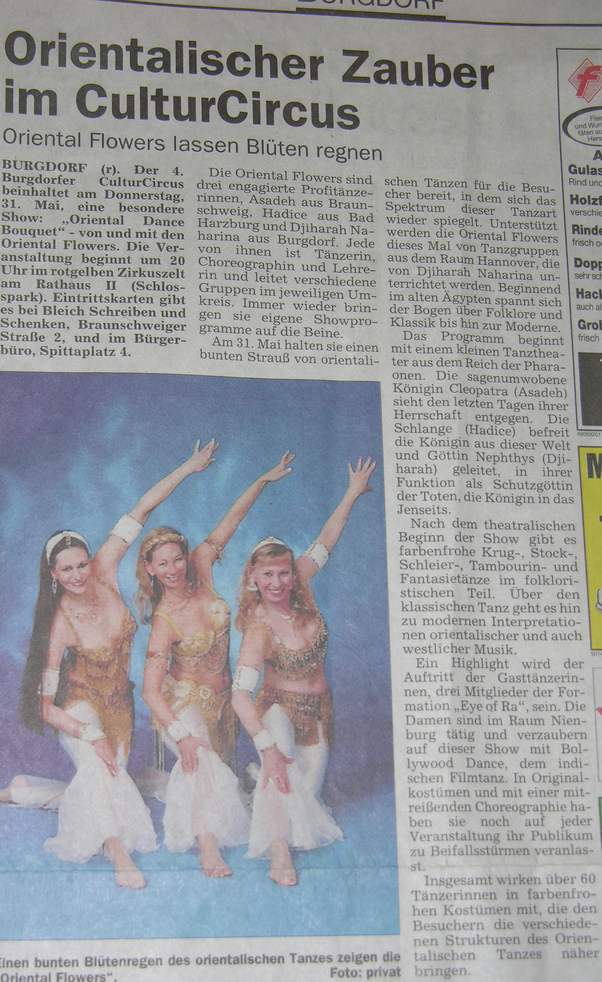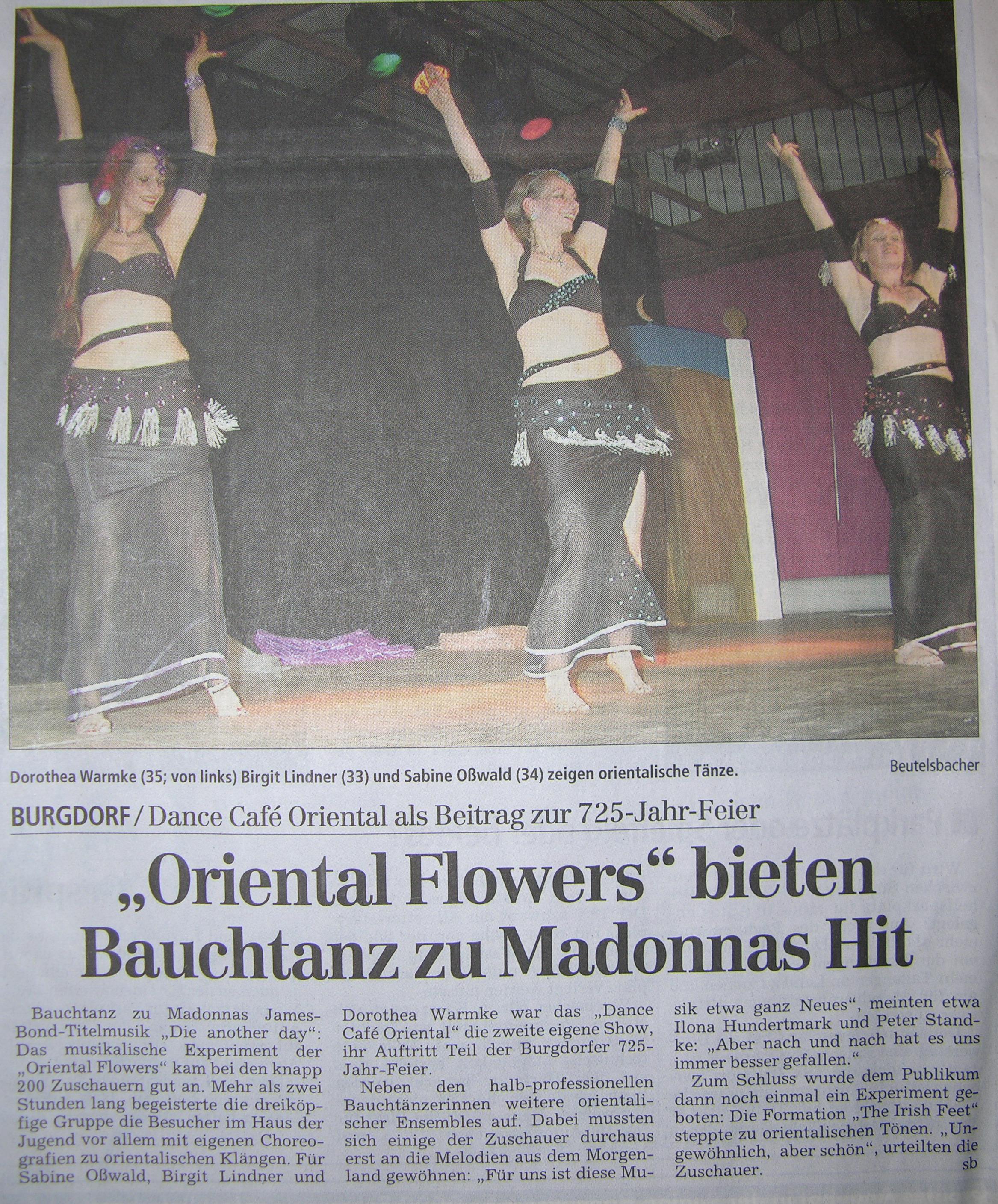 | "Oriental Flowers" bieten Bauchtanz zu Madonnas Hit BURGDORF / Dance Café als Beitrag zur 725-Jahr-Feier Bauchtanz zu Madonnas James-Bond-Titelmusik "Die another day": Das musikalische Experiment der "Oriental Flowers" kam bei den knapp 200 Zuschauern gut an. Mehr als zwei Stunden lang begeisterte die drei köpfige Gruppe die Besucher im Haus der Jugend vor allem mit eigenen Choreographien zu orientalischen Klängen. Für Sabine Oßwald, Birgit Lindner und Dorothea Warmke war das "Dance Café Oriental" die zweite eigene Show, ihr Auftritt Teil der Burgdorfer 725-Jahr-Feier. mehr lesen ... |