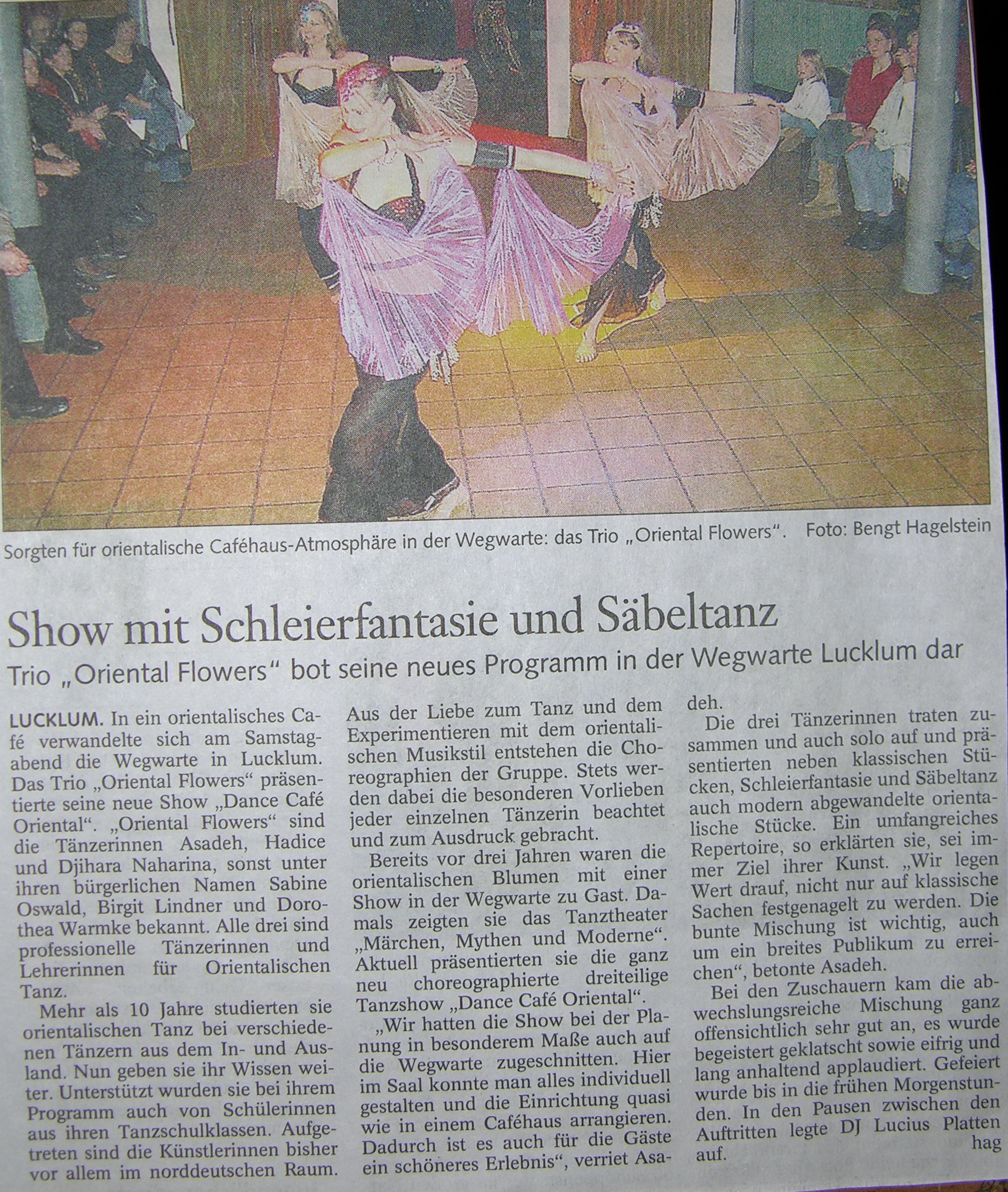 | Show mit Schleierfantasie und Säbeltanz Trio "Oriental Flowers" bot seines neues Programm in der Wegwarte Luklum dar LUCKLUM. In ein orientalische Café verwandelte sich am Samstagabend die Wegwarte in Lucklum. Das Trio "Oriental Flowers" präsentierte seine neue Show §Dance Café Oriental". "Oriental Flowers" din die Tänzerinnnen Asadeh, Hadice und Djihara Naharina, sonst unter ihren bürgerlichen Namen Sabine Oswald, Birgit Lindner und Dorothea Warmke bekannt. Alle drei sind professionelle Tänzerinnen und Lehrerinnen für Orientalischen Tanz. mehr lesen ... |
